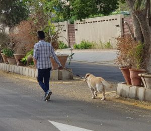 Dogs are known by the masters they keep. A loving master will walk his dog. A rich master will hire a person to do this. Twice a day, the subcontracted walkers and (in some cases motor cyclists) are seen on and around the Jabal with a dog at one end and a sad looking leash holding sub-contractor at the other.